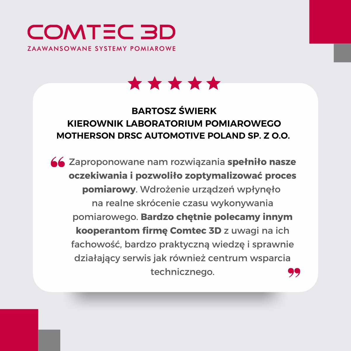 🤝 Współpraca z nami naprawdę coś zmienia! Gdy wdrożenie nowego rozwiązania realnie skraca czas pomiarów, a serwis i wsparcie techniczne działają tak, jak powinny – to znak, że robimy swoją robotę dobrze. 📣 Tak mówi o współpracy z nami Pan Bartosz Świerk, Kierownik Laboratorium Pomiarowego w Motherson DRSC Automotive Poland Sp. z o.o. (dawniej Dr. Schneider Automotive Polska) Motherson Group: „Zaproponowane nam rozwiązanie spełniło nasze oczekiwania i pozwoliło zoptymalizować proces pomiarowy. Wdrożenie urządzeń wpłynęło na realne skrócenie czasu wykonywania pomiarów. Bardzo chętnie polecamy innym kooperantom firmę COMTEC 3D z uwagi na ich fachowość, bardzo praktyczną wiedzę i sprawnie działający serwis oraz centrum wsparcia technicznego.” Dziękujemy za zaufanie! To dla nas ogromna motywacja, by każdego dnia wspierać firmy w drodze do jeszcze lepszej precyzji i jakości. #COMTEC3D #Metrologia3D #CMM #ZaufanieKlientów #WsparcieTechniczne #zNamiTechnologiaMaWymiar